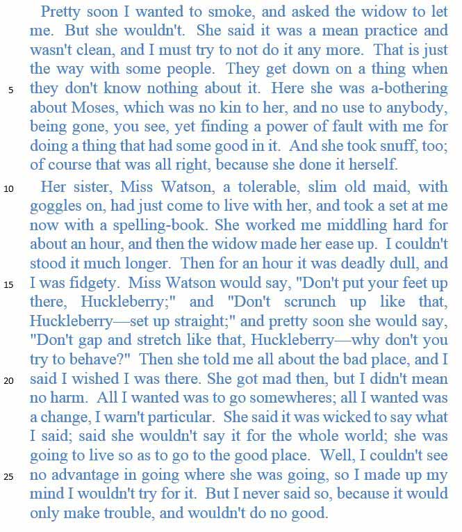 For the following questions we will be referring to a passage from 'The Adventures of Huckleberry Finn' by Mark Twain. The story is set in the nineteenth century, in the USA. The main character, the narrator, is a boy called Huckleberry. He lives with Widow Douglas, who has been teaching him about Moses.