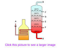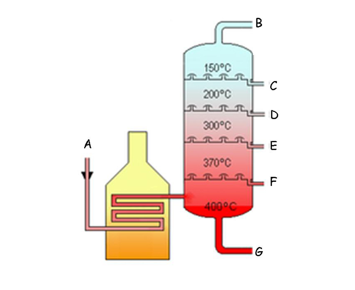 The many hydrocarbons in crude oil may be separated into fractions, each of which contains molecules with a broadly similar number of carbon atoms. This is achieved by evaporating the oil and allowing it to condense at a number of different temperatures. This process is called fractional distillation and takes place in a fractionating column. For your GCSE exam, you need to know and understand the main processes in continuous industrial fractional distillation. You will also need to be able to demonstrate that you know the shorter chain hydrocarbons are obtained from higher in the column and vice-versa. You may also find it useful (but it's not essential) if you are able to remember the names and uses of the fractions.