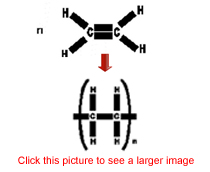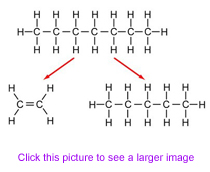 One of the by-products of cracking is molecules of a family of chemicals that is not naturally found in crude oil - the alkenes. These are unsaturated molecules (contain a double bond between at least one pair of carbon atoms) that are more reactive than the original alkanes. The main things that you need to know about these are that the simplest alkene is ethene, that they will discolour bromine water and can join together to form extremely long molecules called polymers.