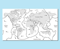 Surrounding the core is the mantle. This takes up most of the rest of the Earth's diameter and is made from very hot rocks. What is really weird is that they are solid, but, because they are hot and under great pressure, they can flow very slowly. The heat from the breakdown of radioactive minerals in the mantle is thought to create hot areas that give rise to huge, slowly moving convection currents. The outer part of the Earth is the crust. This is made from solid rocks - sedimentary, igneous and metamorphic. Compared to the other layers, it is very thin. It is broken into large sections called tectonic plates by faults (breaks in rocks). The convection currents in the mantle drag the tectonic plates around the surface of the Earth. Where they collide and move past each other, you get earthquakes, deep sea trenches and mountain ranges. Where the tectonic plates are moving apart, new crust is formed as rocks from the mantle erupt from below, cool, and attach themselves to the edge of the plates.