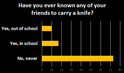 One-tenth of our respondents said that they have known a friend to carry a knife out of school. That figure sounds low but it is worse than you might think. Imagine a street with fifty children on it. According to our results, five of them could be armed - a frightening thought.